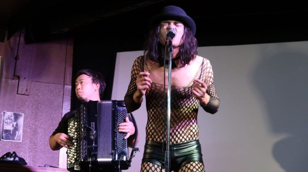 三番手は音楽ステージ。「全身網タイツの地獄シャンソン歌手」と自ら名乗る蜂鳥あみ太=4号さんが登場すると、場内は一気にざわめきます。その異彩を放つ姿に観客の目は釘付け。映画館はあっという間にライブハウスの熱気へと変わっていきました。